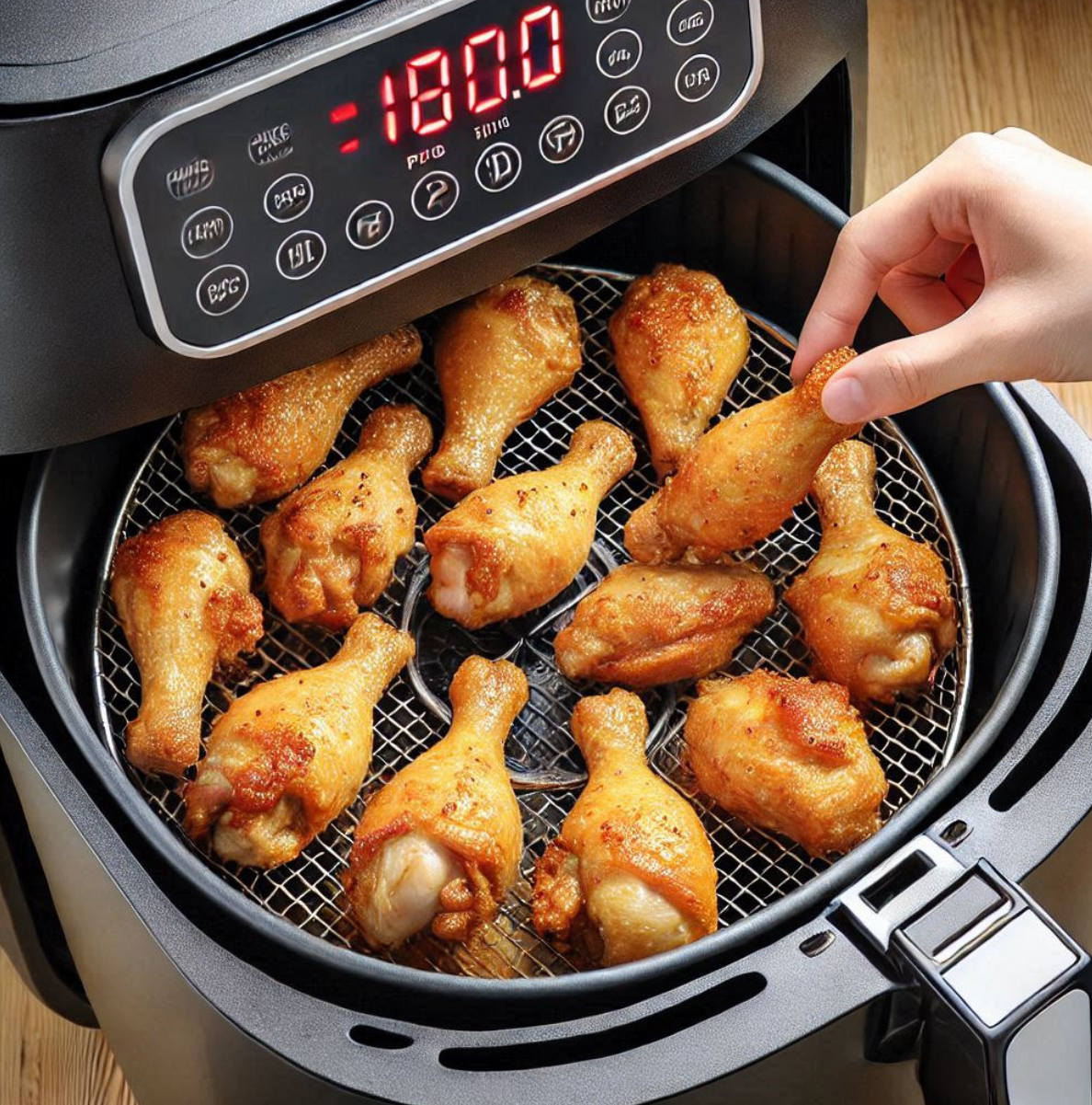 - 치킨을 에어프라이어에 넣고 180°C에서 3~5분 정도 데우세요.